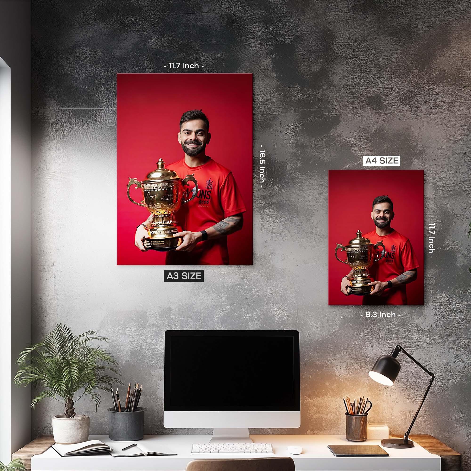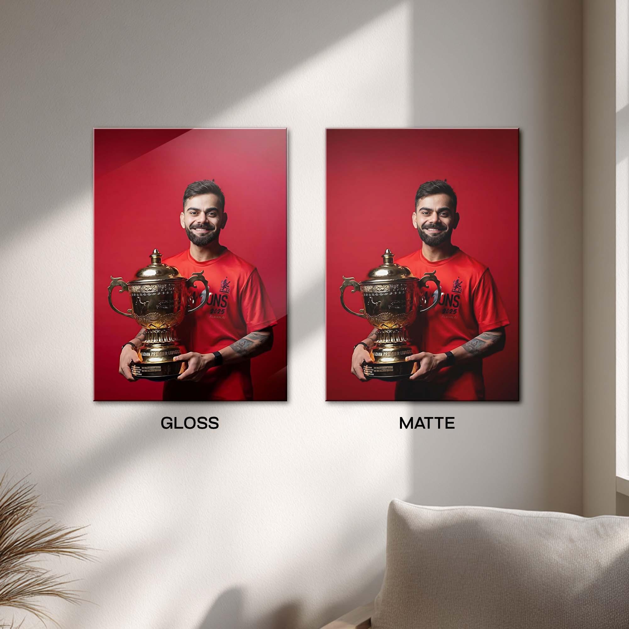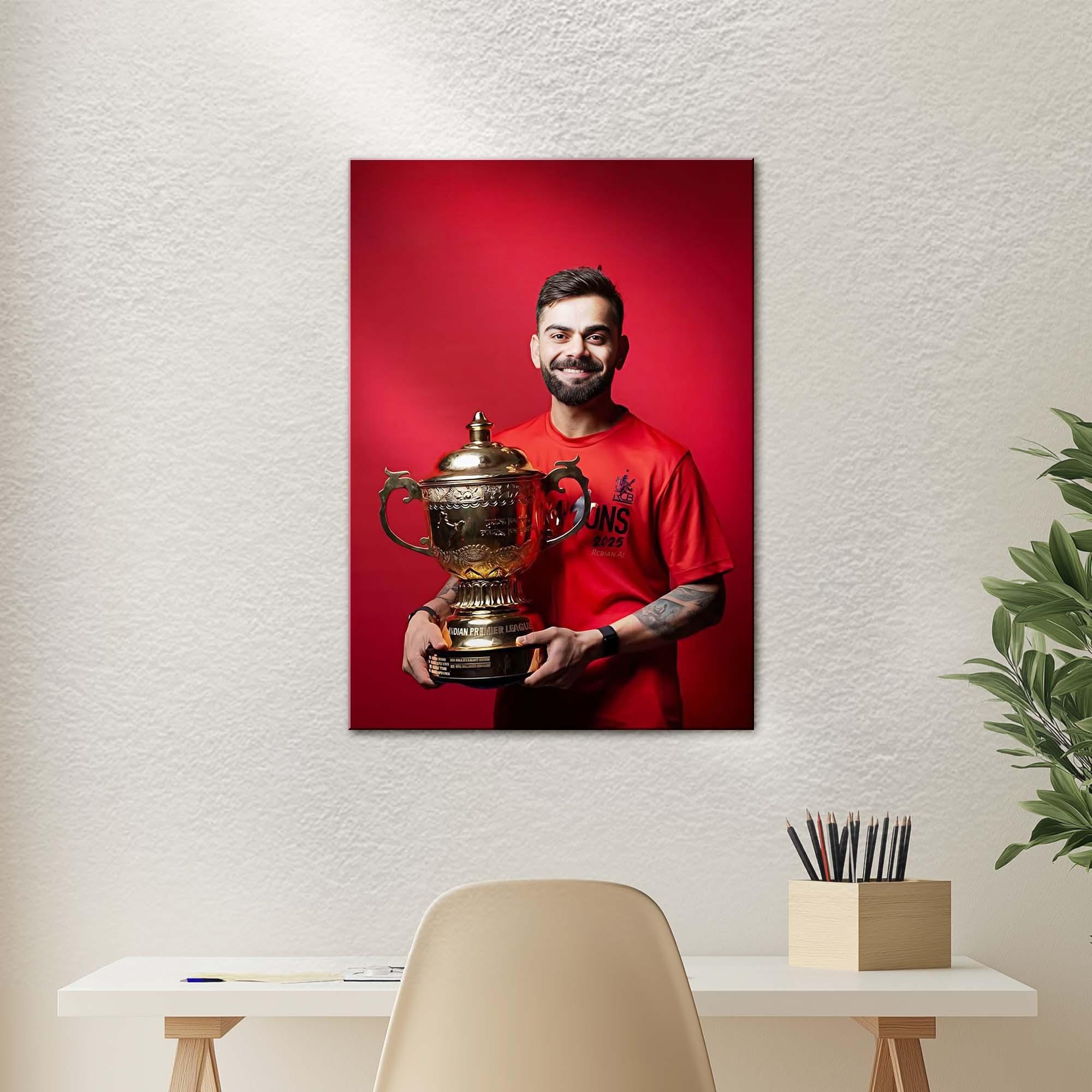 The rich crimson tones enhance the hero-like presence of the figure, while the metallic sheen of the trophy adds unmatched depth and visual brilliance. The athlete’s expressive smile, vibrant sports jersey, and victorious stance capture the raw thrill of triumph — making this piece a perfect statement for fans who live for unforgettable sporting moments.