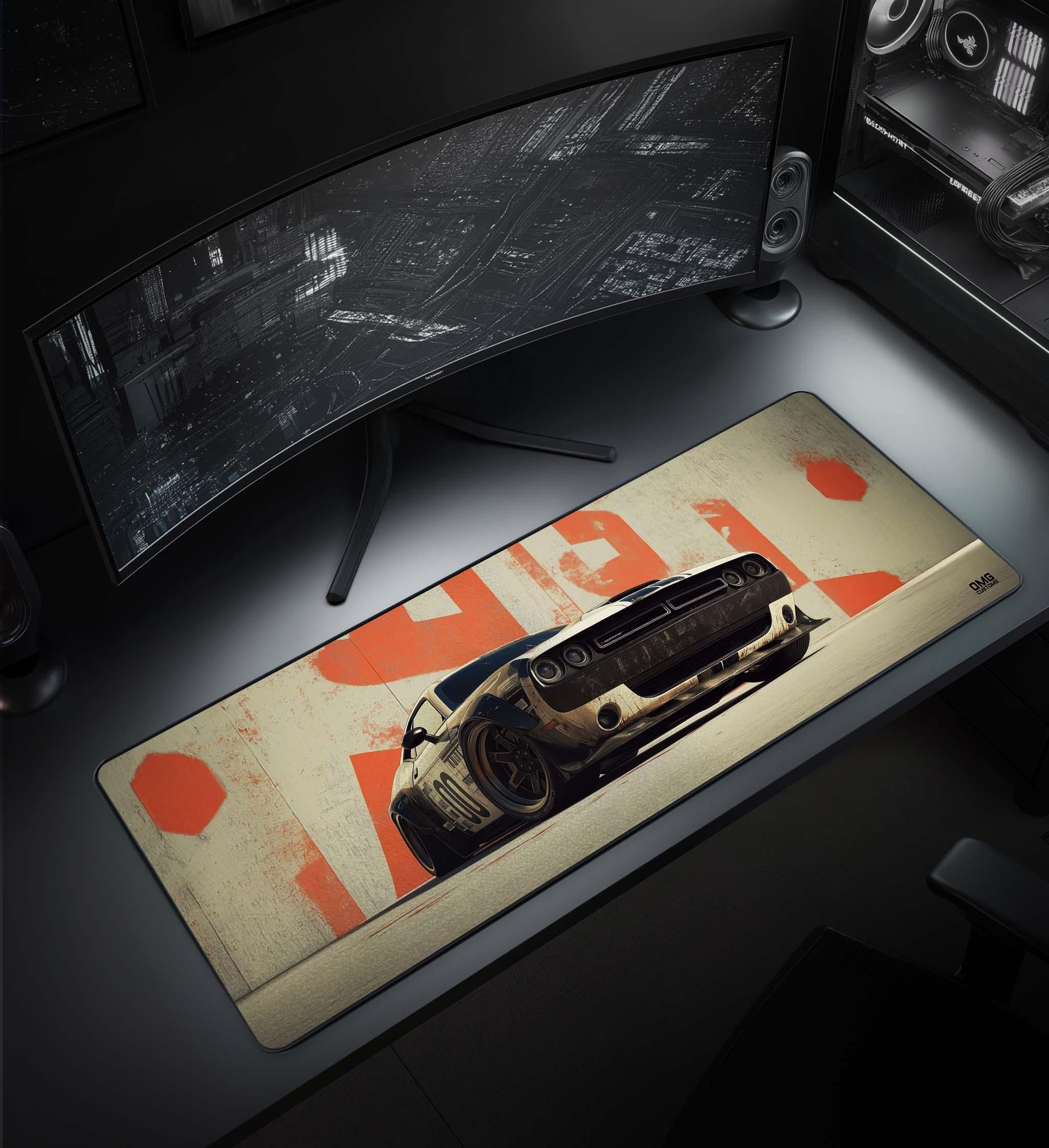 This artwork isn’t about spectacle. It’s about restraint. Power held in check. Confidence without noise. The car doesn’t need to move to feel fast — it already owns the space it’s in. The panoramic composition stretches the scene across the desk, grounding your setup in grit, weight, and intent.