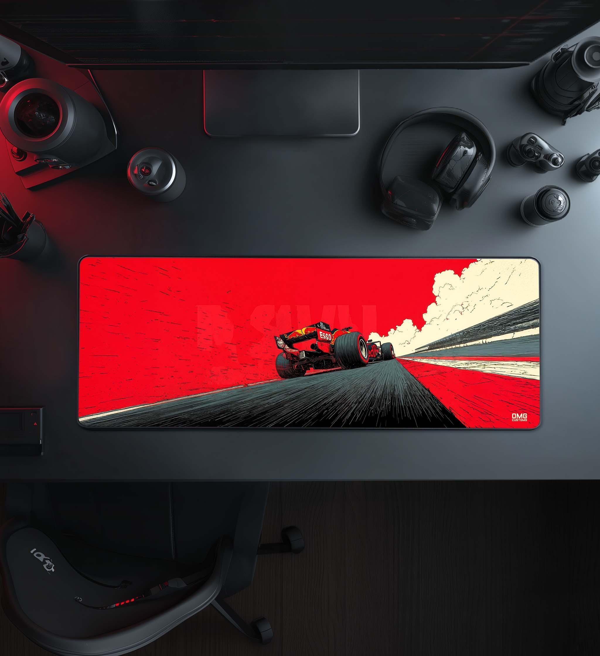 The bold red backdrop isn’t decorative — it’s emotional. It signals danger, dominance, and absolute commitment. The car feels heavy, powerful, and unstoppable, angled forward with purpose as the circuit bends beneath its weight. Black, white, and red collide in a graphic, almost illustrated style that turns motion into art and speed into attitude.