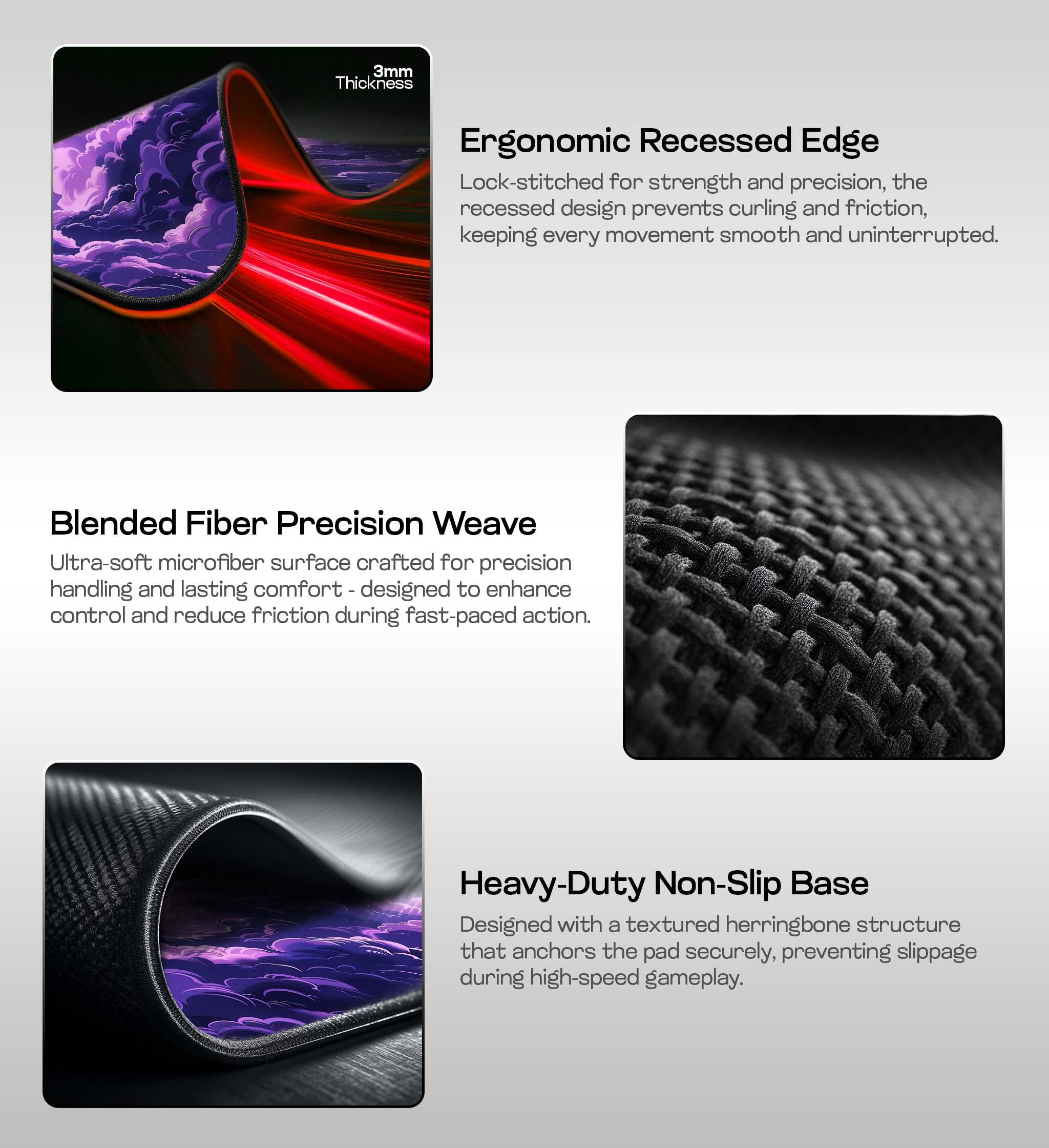 Beneath the art, precision engineering delivers serious performance: a micro-textured surface for effortless glide and pinpoint accuracy, anti-fray stitched edges built to last, and a non-slip natural rubber base that keeps your focus grounded while your imagination takes off.