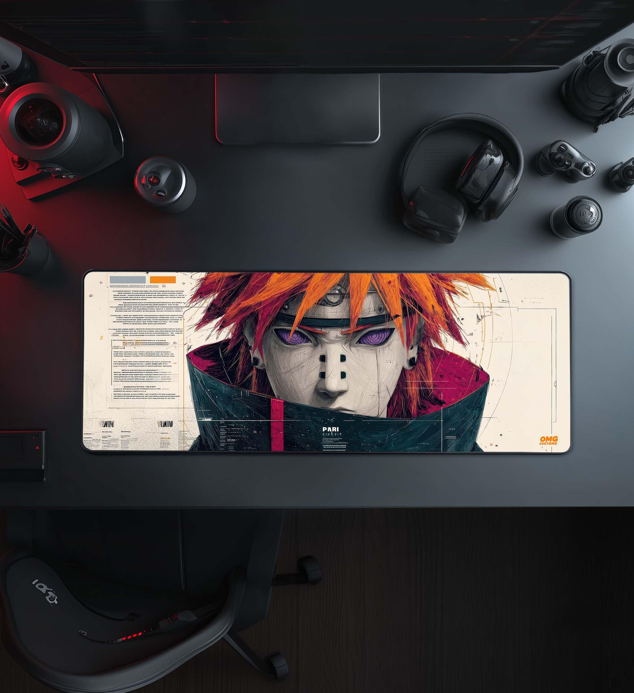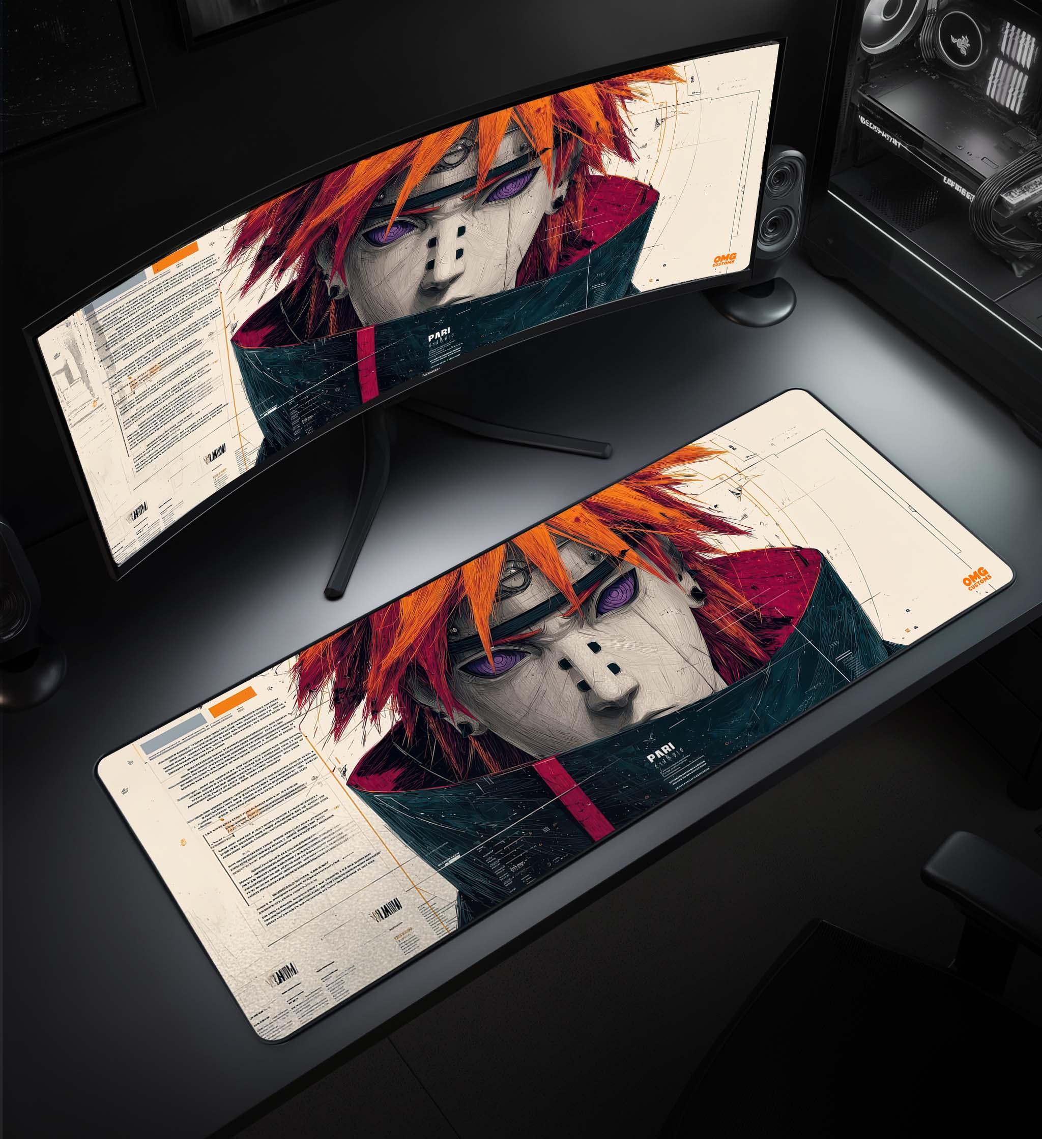 Every pixel radiates intensity — from the hypnotic ripple of his Rinnegan eyes to the sharp contrast of crimson, ash, and parchment tones. The design combines cyber-mechanical blueprint detailing with traditional brush textures, symbolizing the balance between destruction and discipline, chaos and order.