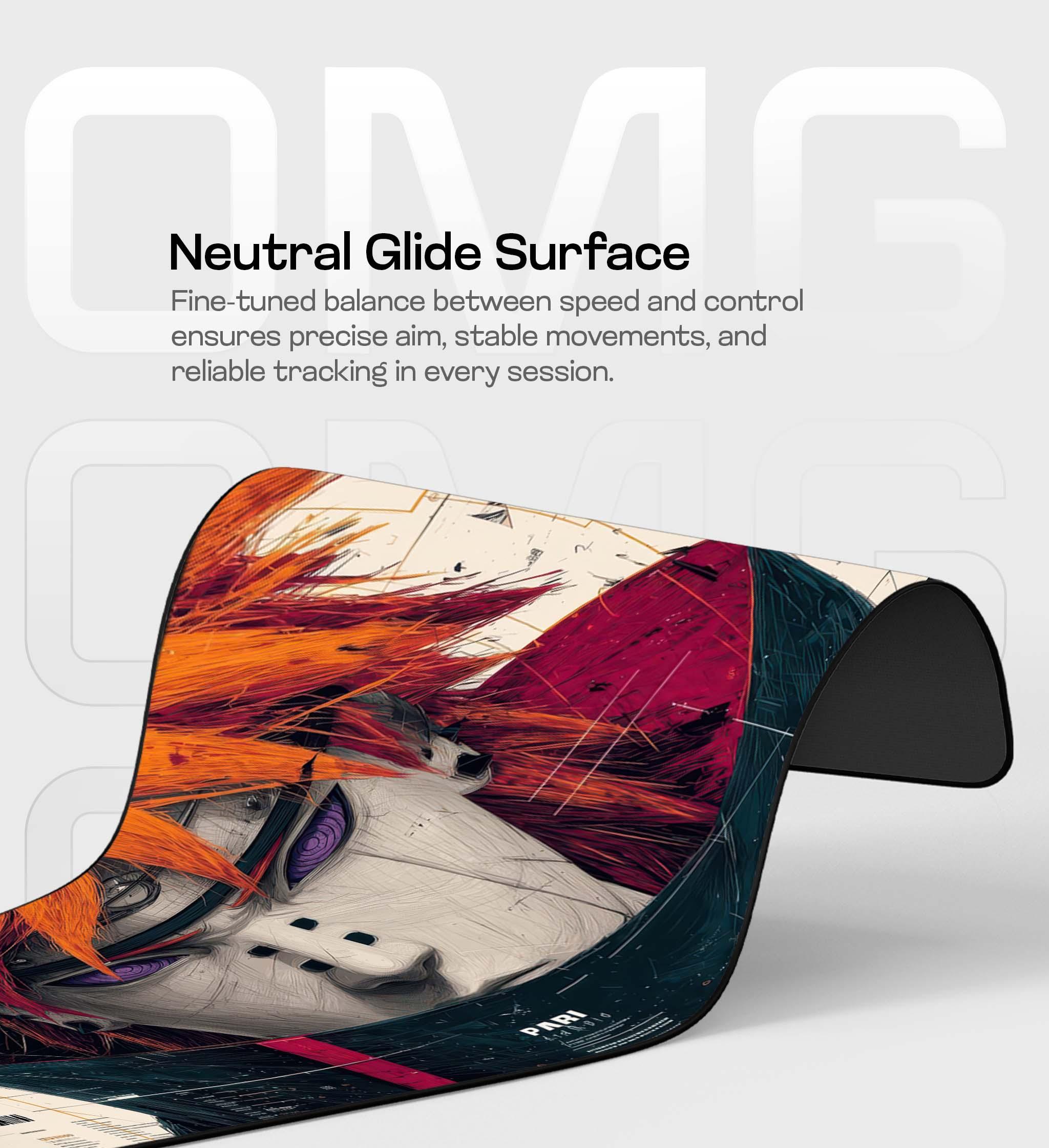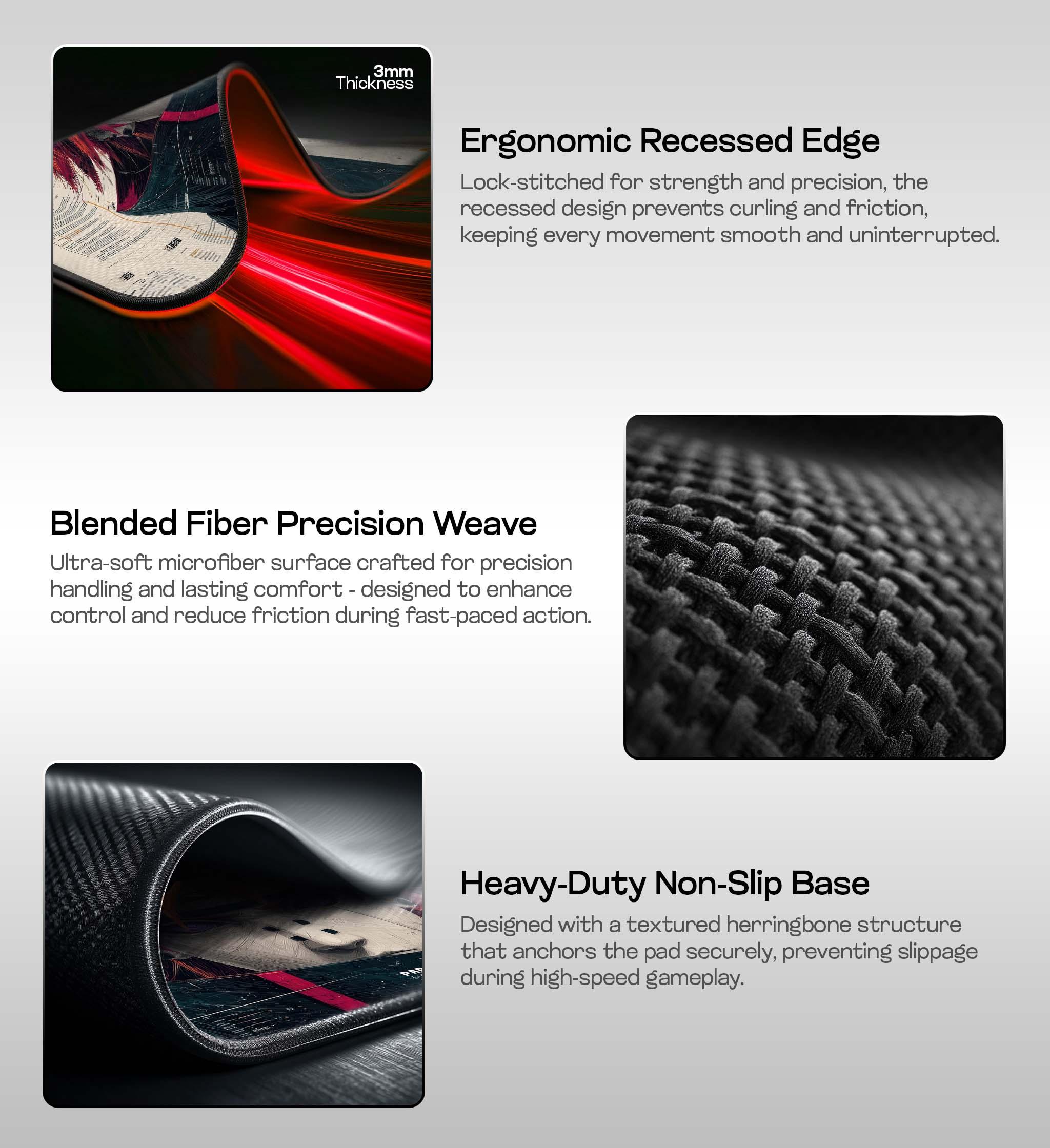 Built for dominance and durability, its micro-textured surface ensures immaculate mouse glide and pixel-perfect accuracy, while the anti-fray stitching and non-slip rubber base anchor you through every mission, match, and masterpiece.