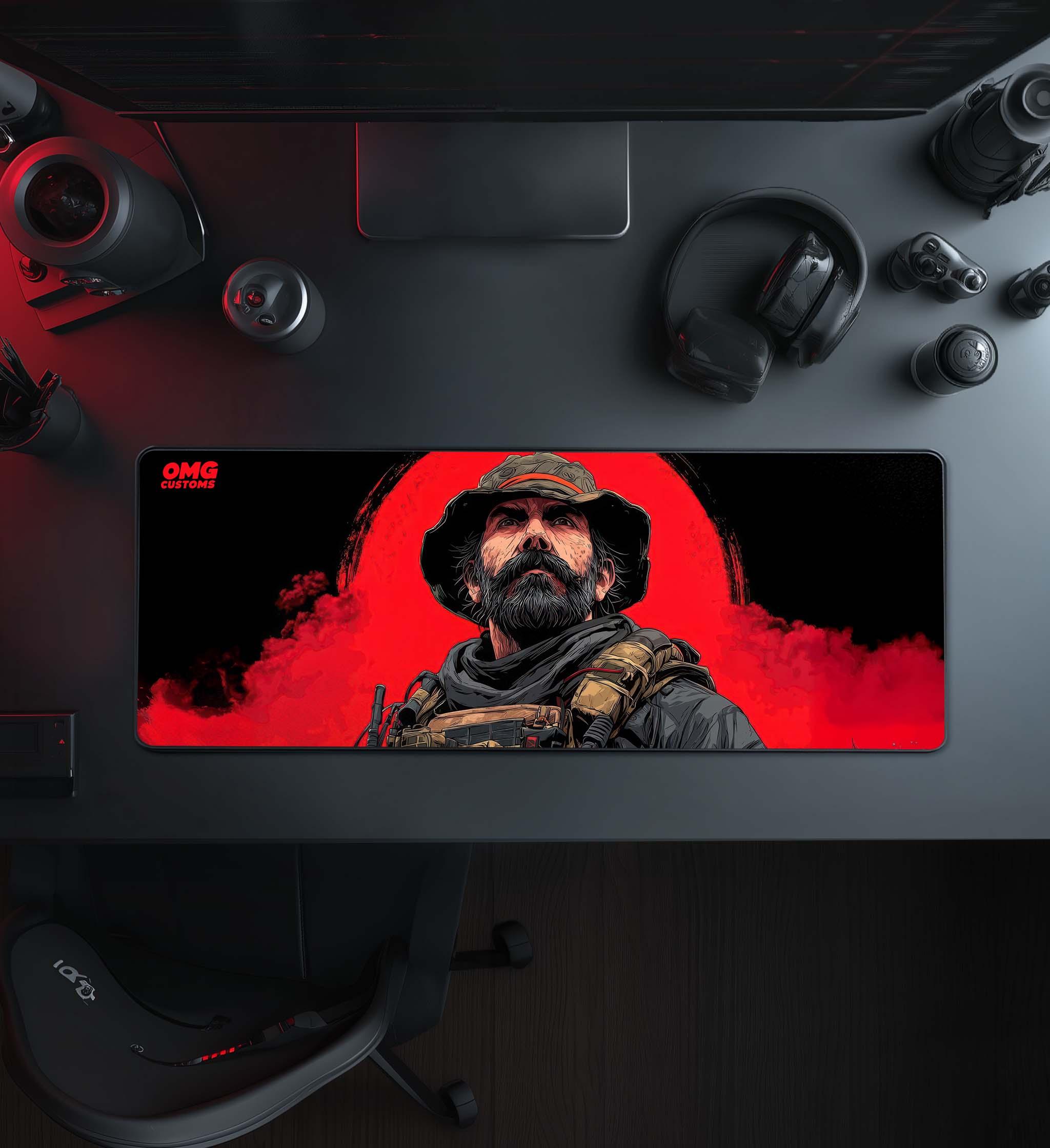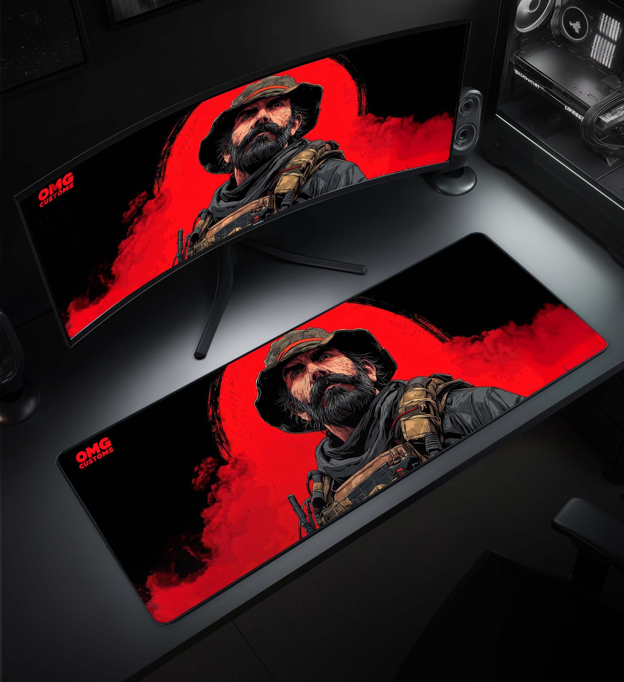 The artwork captures a battle-hardened operator standing firm against a burning crimson horizon — a symbol of resilience under fire. His stance exudes experience, precision, and unyielding focus. The intense red and black contrast mirrors the chaos of combat and the calm of control, delivering a design that feels alive with tension and purpose.
