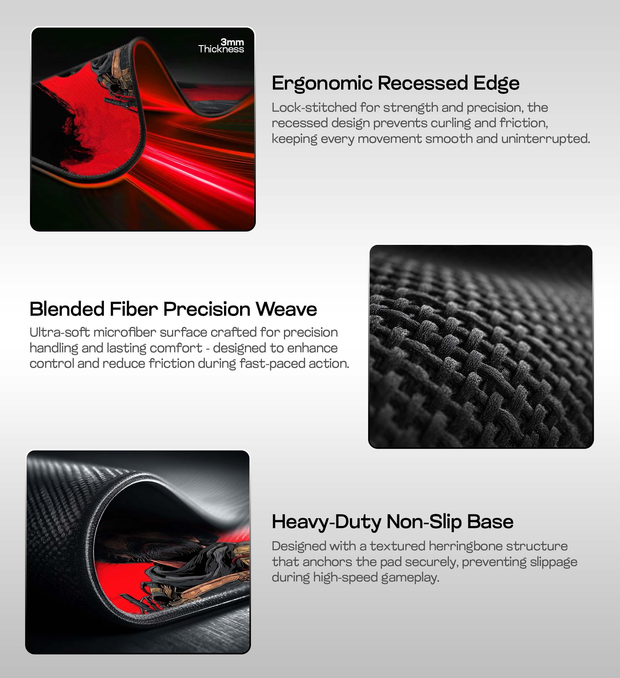Engineered for those who play to win, the micro-textured surface provides razor-sharp tracking and fluid glide, while anti-fray stitching and a reinforced non-slip rubber base ensure rock-solid reliability under any pressure. Built not just for performance — but for presence.
