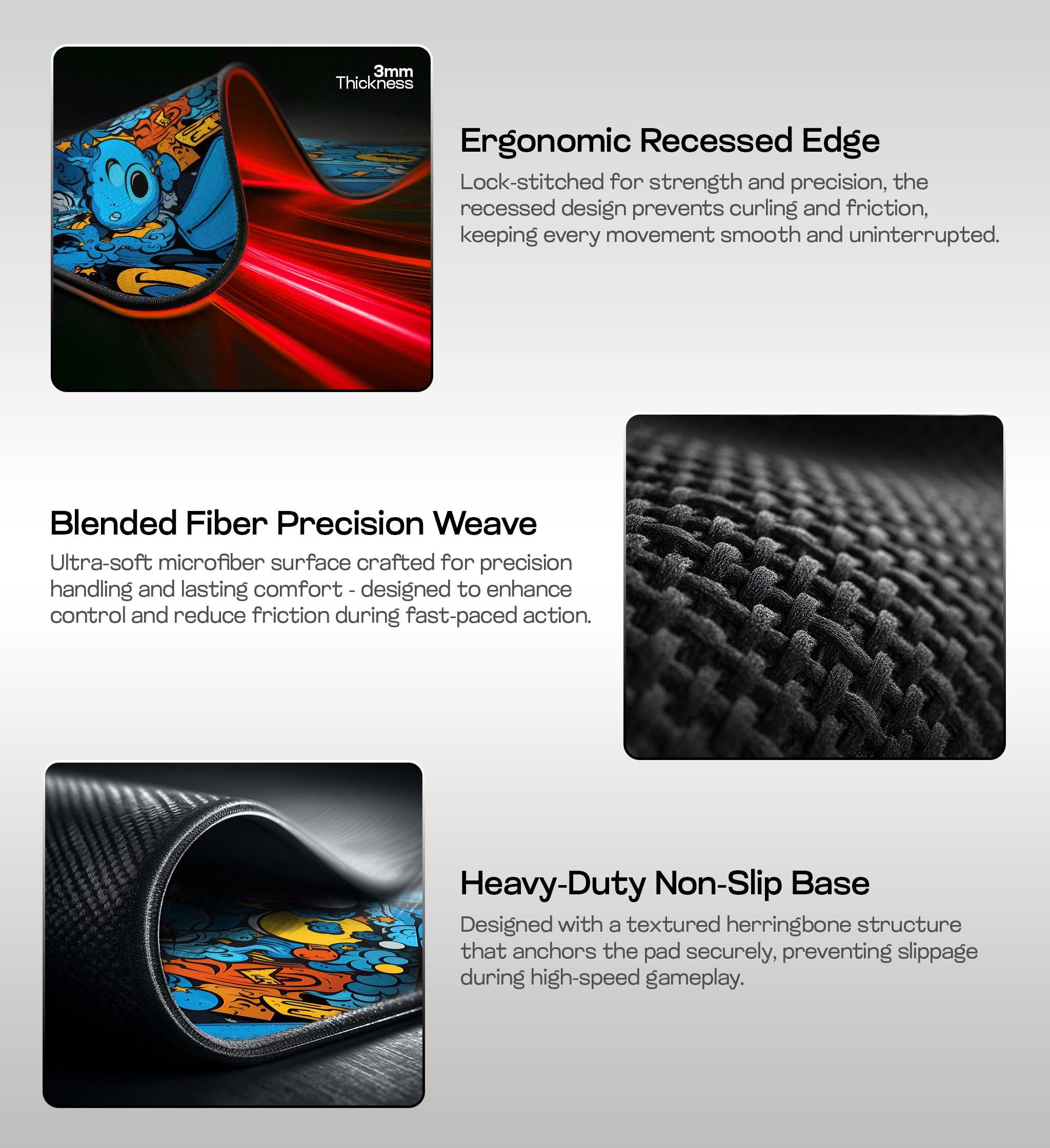 Built for creators and gamers who thrive on flow, its micro-textured surface guarantees flawless tracking, while anti-fray stitched edges and a no-slip base ensure every move hits with confidence and control.